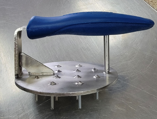 Presse à hamburger à 4 broches. Acier sur mesure de Quest Metal, manche en Thermalloy.