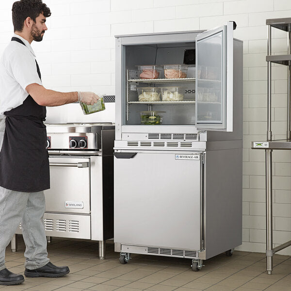 Beverage-Air offers a complete commercial refrigeration lineup for kitchens, bars, and display: reach-ins, worktops and undercounters, sandwich and pizza prep tables, chef bases, bar and wine equipment (back bars, direct-draw beer, bottle coolers, glass and plate chillers), merchandisers and deli cases, milk coolers, and blast chillers. Select series include Cross Temp® models that switch between refrigerator and freezer for flexible storage.