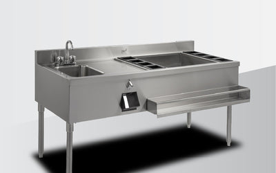 All-stainless Quest bar sink units combine a utility sink and faucet with an insulated ice bin, speed rail and scrap chute to create a compact, full-service bartender station.