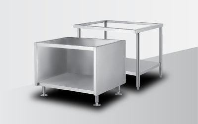 Tubular stands and cabinet bases provide sturdy equipment support with optional shelves and enclosed storage.