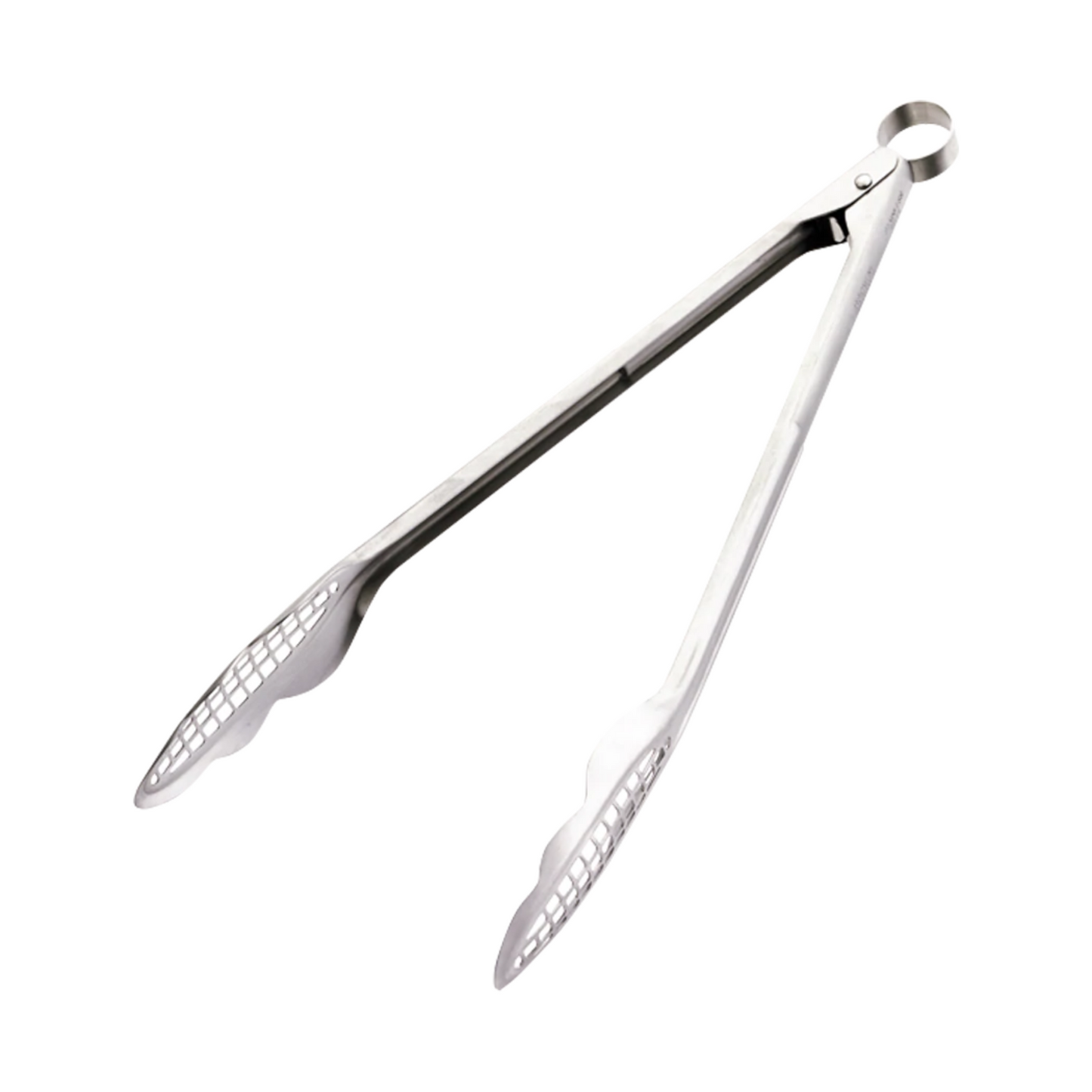 The holes allow easy draining of fats and oils while the loop at the top of the handle allows the tongs to be hung for space-efficient storage. Additionally, the grooved and offset handle design provides a secure and comfortable grip.