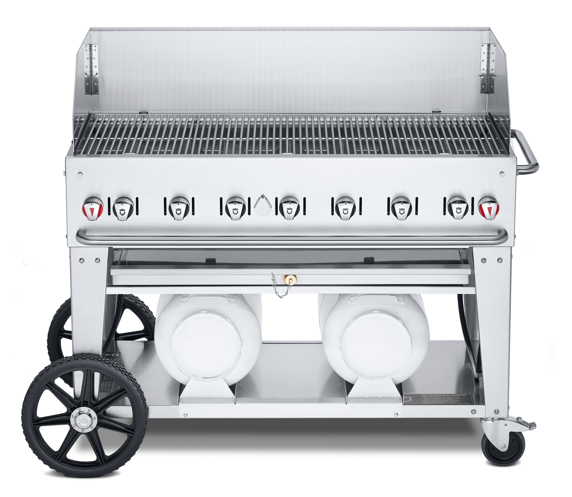 It has two stage regulators and hoses and includes water pan with drain ports to ease cleaning and help eliminate grease fires from occurring. The two 14" wheels and two locking casters transport this commercial grill with ease while the handle offers a secure grip while pushing the grill. The temperature control knobs make this grill simple to adjust while the windguard protects the flame and keeps heat within the cooking area.