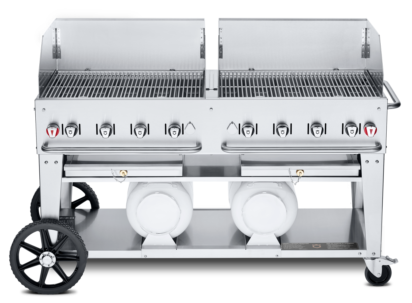 Made with a 304 stainless steel construction, the Crown Verity Club Series 60" Grill with Two 30" Winguards is built to last. It features heavy-duty brackets that secure the two 30 lb propane tanks on the undershelf.