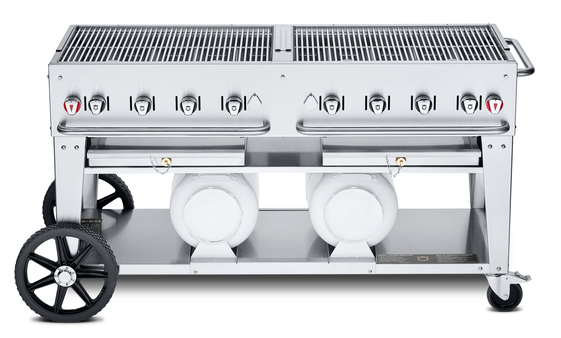 The Crown Verity Club Series 60" Grill has a strong 304 stainless steel construction that's simple to maintain and lasts through rigorous use. It features heavy-duty brackets that secure the two 30 lb propane tanks on the undershelf while the two 14" wheels and two locking casters transport the grill wherever you need it. Plus, it has a handle that eases transportation and offers a secure grip.