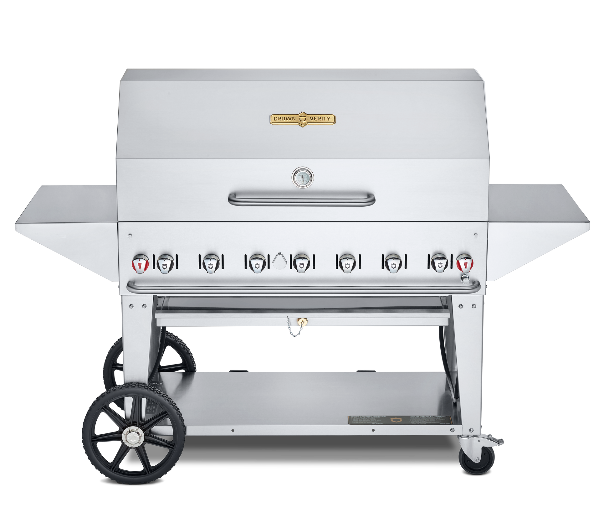 Crown Verity Mobile 48" Gas Grill with Roll Dome, Bun Rack, 2 Removeable End Shelves & BBQ Cover, Propane/50 & 100 lb Tanks - CV-MCB-48SI50/100PRO