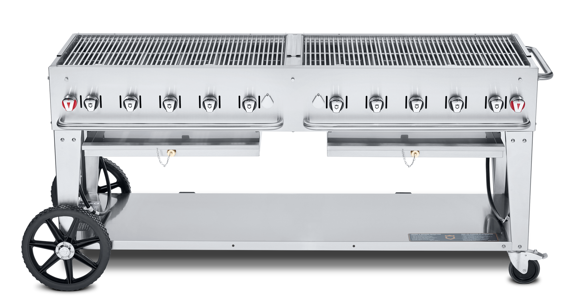 This commercial outdoor grill comes standard with water pans that include drain ports to ease cleaning and help eliminate grease fires from occurring. It's designed with two 14" wheels and two locking casters that transport the grill wherever you need it while the handle offers a comfortable grip while maneuvering the grill.