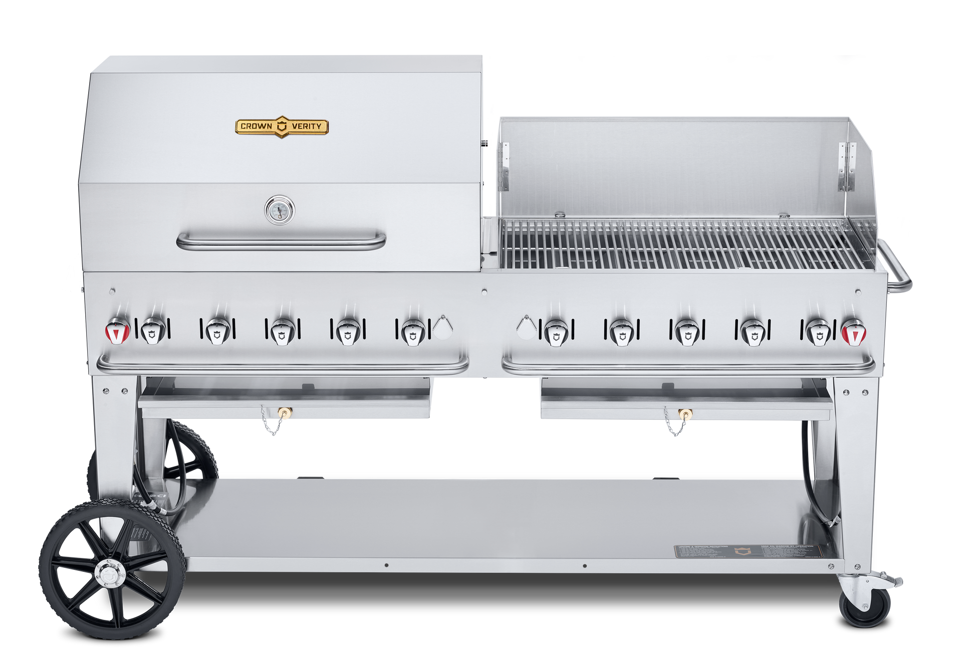Designed with versatility and professional quality, the Crown Verity Mobile 72" Gas Grill with 36" Roll Dome, Bun Rack and Windguard is built to be your new favourite outdoor grill. Made of 304 stainless steel, this commercial grill is built with quality. It has two 14" wheels and two locking casters for simple transportation while the handle is comfortable to hold.