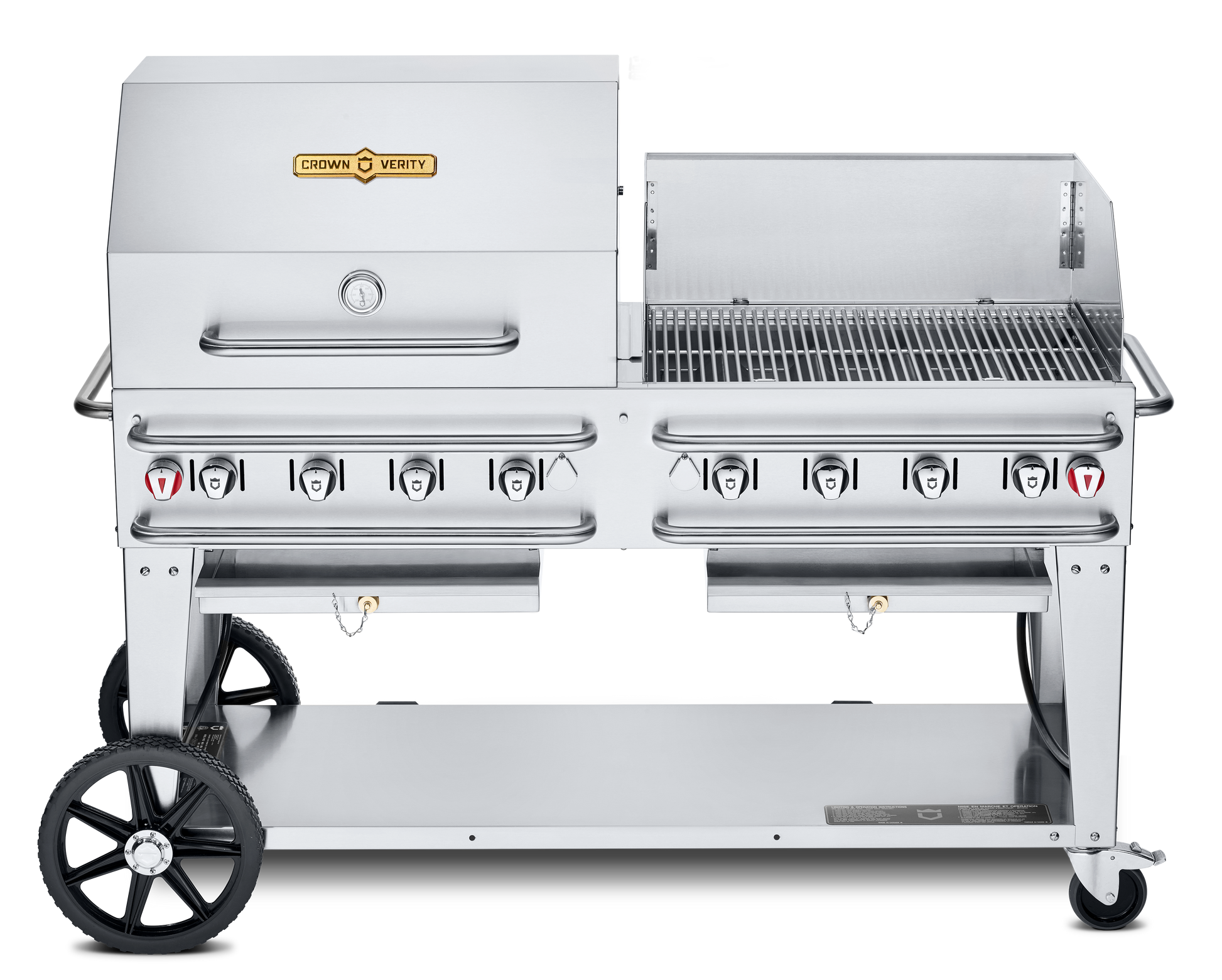 The Crown Verity Pro Series Rental 60" Gas Grill with a Roll Dome Lid and Windguard is made of strong 304 stainless steel for a long-lasting construction. It has 8 stainless steel burners that offer 15,000 BTUH of power and are evenly placed every 5.75" for consistent heating. Additionally, the roll dome and windguard protects the grill's flame and retain heat while the adjustable bun rack is versatile.