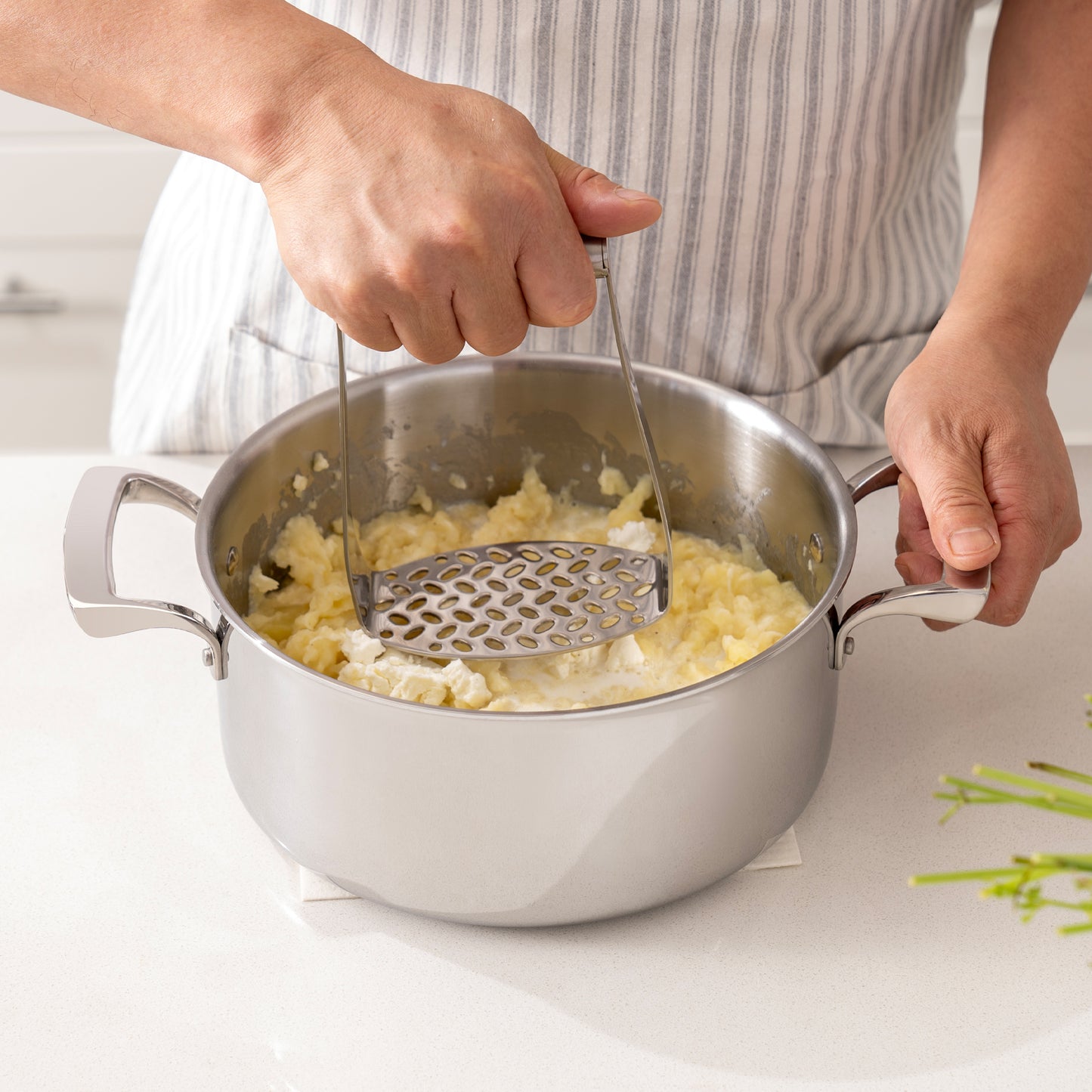 Create perfectly soft mashed potatoes with the Cuisipro 7" Stainless Steel Tempo Potato Masher. The large handle provides a secure grip for effortless mashing and is tall to keep hands away from food to prevent cross-contamination.