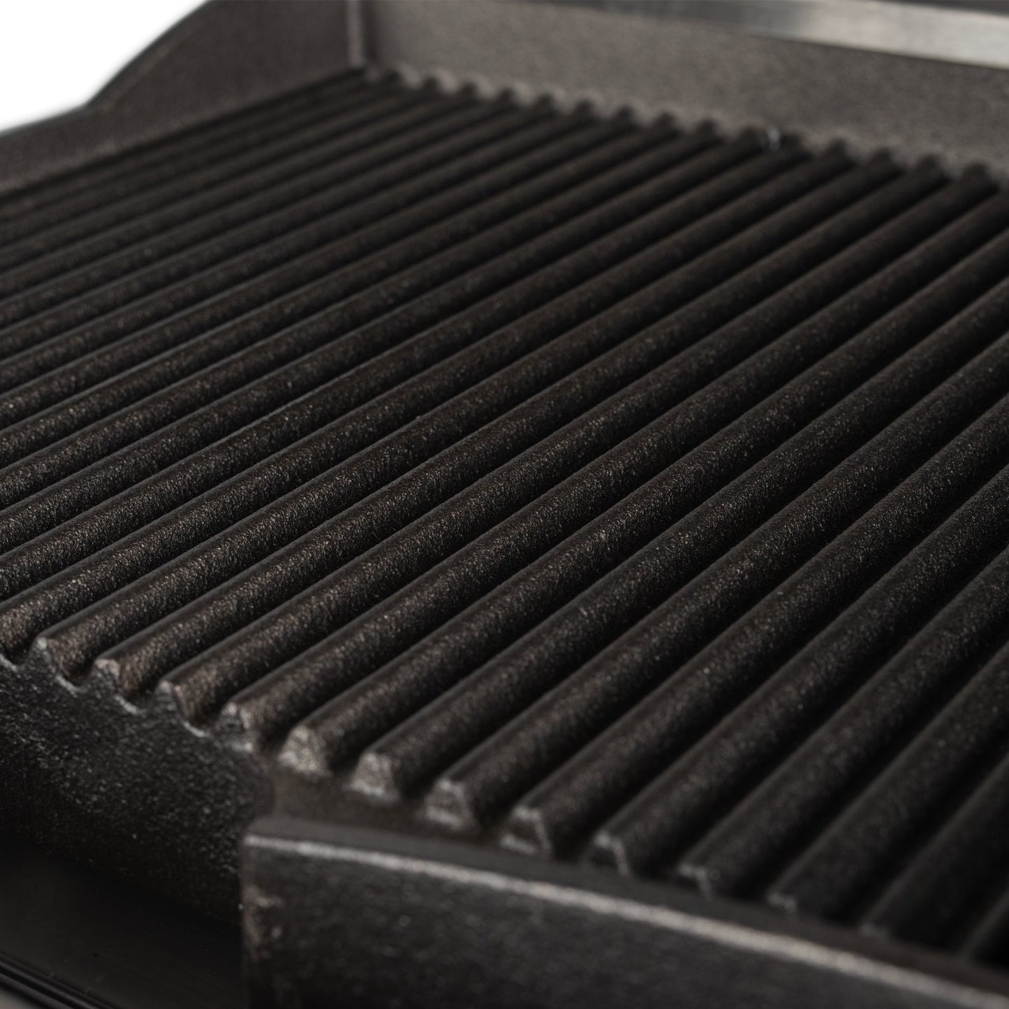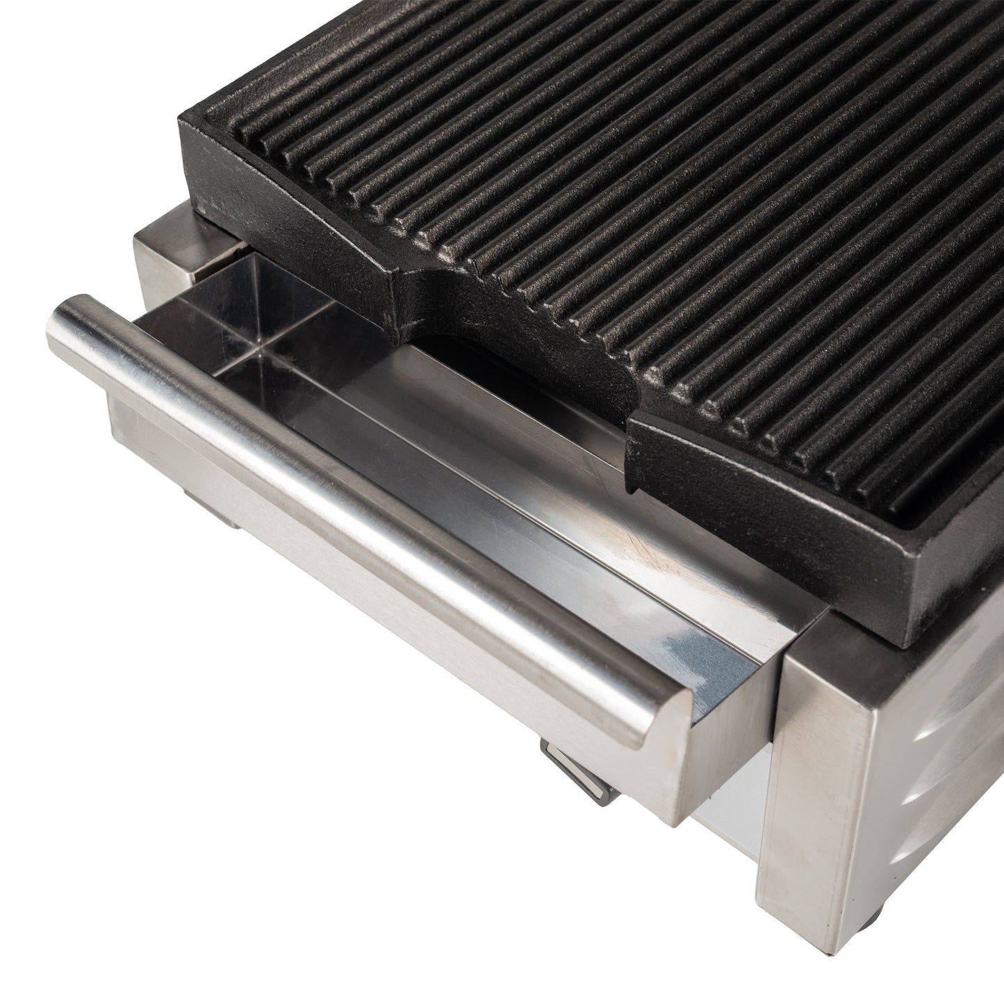 The stainless steel exterior and cast iron grill are durable and simple to clean. This long-lasting panini grill is ideal for your commercial kitchen and can be used daily.