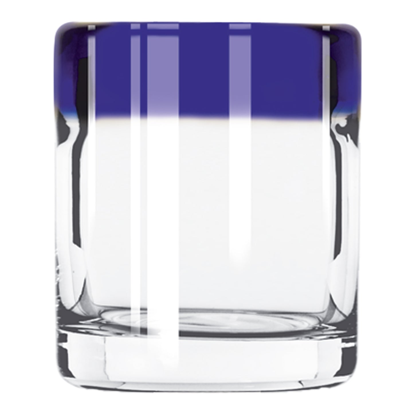 Dimensions: 3-3/4" H x 3-1/8" DIA; 3-1/8" top; 3" bottom Capacity: 10 oz Cobalt blue rim Anneal treated Dishwasher and microwave safe Hand blown Glass Aruba