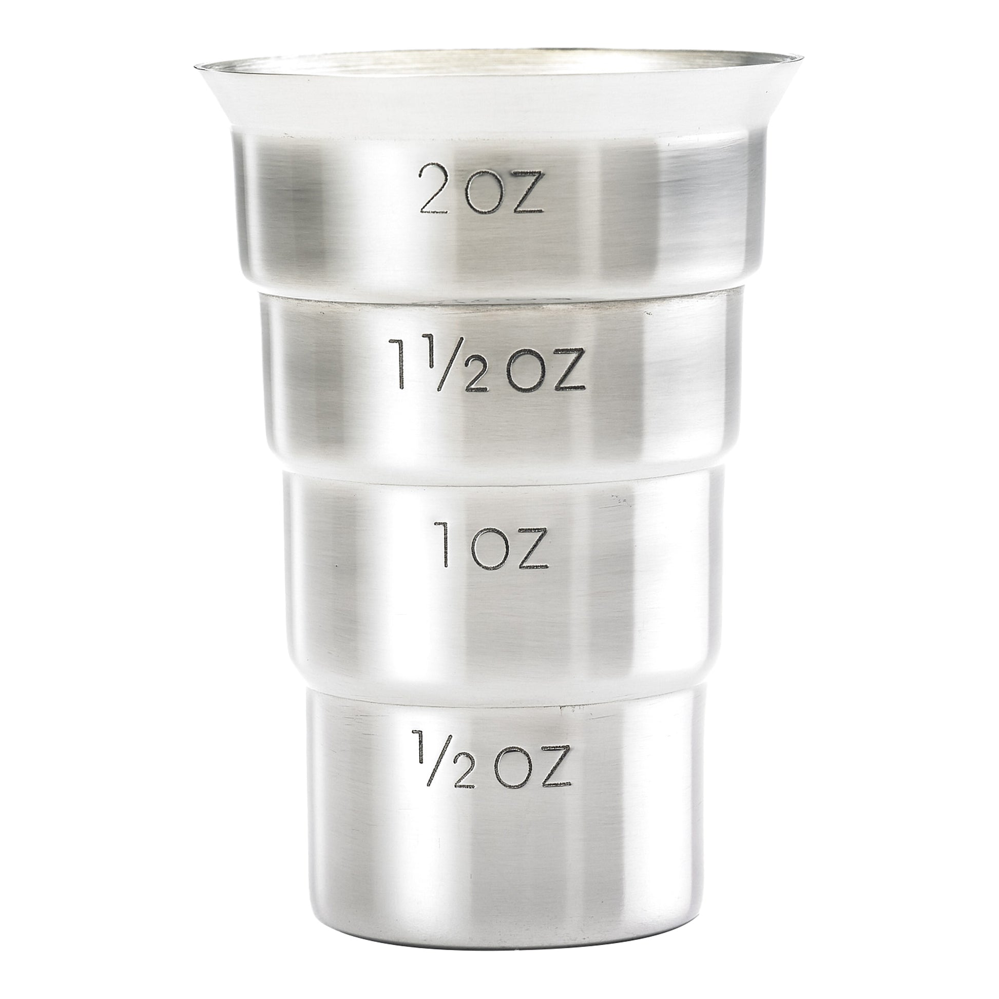The stainless steel body provides fantastic strength while the no-handled design makes this jigger great for space-efficient storage. Jigger has external measurements on the side of 1/2 oz increments that go up to 2 oz.