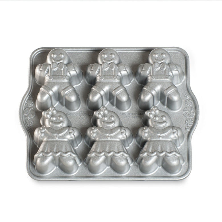 Enjoy this holiday classic without needing to roll out or cut dough! The Nordic Ware 6 Cavities Gingerbread Kids Cakelet Pan is perfectly sized for individual desserts and is the perfect addition to your traditional cookie baking party.