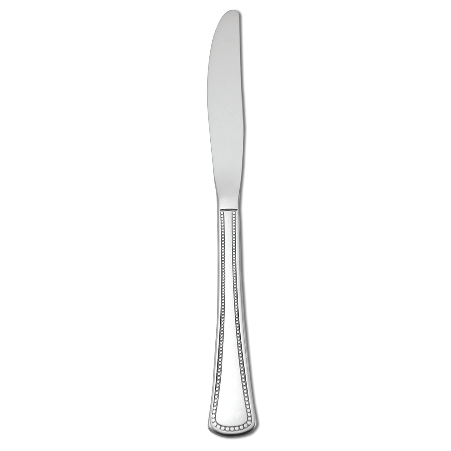 The Oneida Needlepoint Dinner Knife is built with a beautiful and strong design. It's made of durable 18/8 stainless steel and features a beaded border on the handle for an attractive finish. This commercial flatware is ideal for a variety of tabletops.