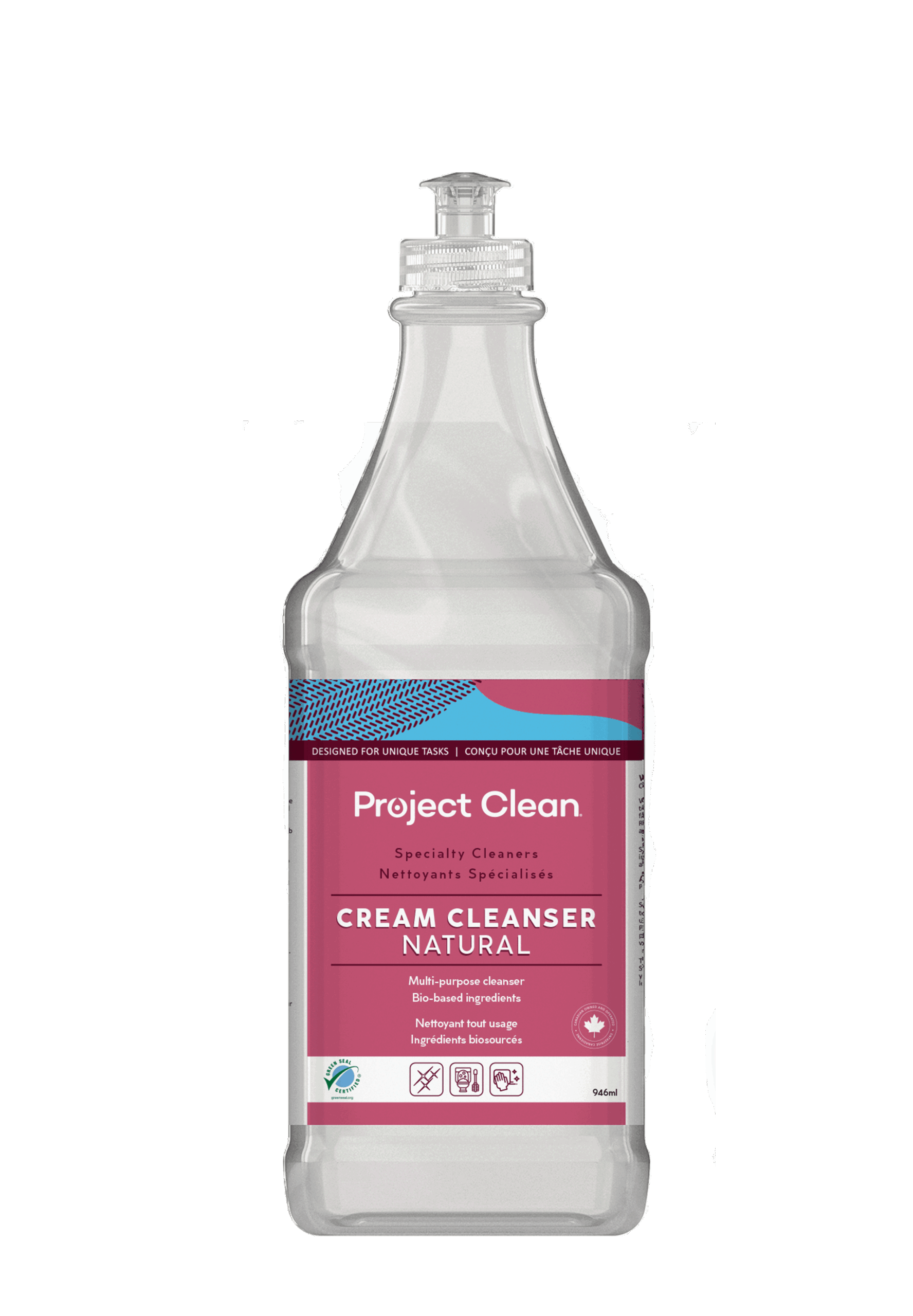 Project Clean Cream Cleanser Natural is a multi-purpose plant-based cleanser with a ready-to-use formula that easily removes soap scum, organic residues and hard water salts, scuffs, grease, rubber marks and stubborn stains while using bio-based ingredients.