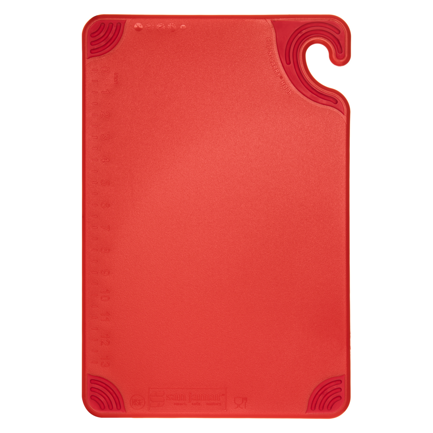 The red San Jamar 12" x 18" Saf-T-Grip Coloured Cutting Board is designed with molded-through grip corners to keep the cutting board secure while being used. It includes an integrated ruler for efficient and accurate portioning.