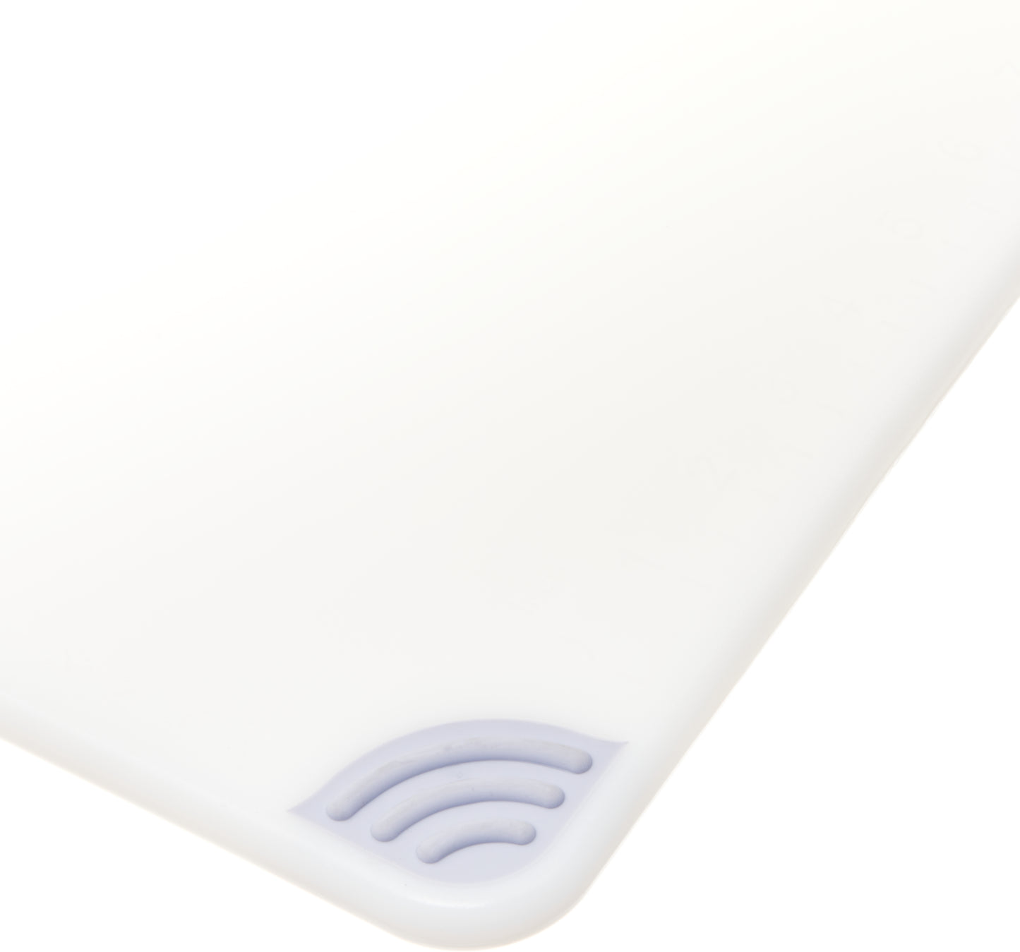 The white San Jamar 12" x 18" Saf-T-Grip Coloured Cutting Board is designed with molded-through grip corners to keep the cutting board secure while being used. It includes an integrated ruler for efficient and accurate portioning.