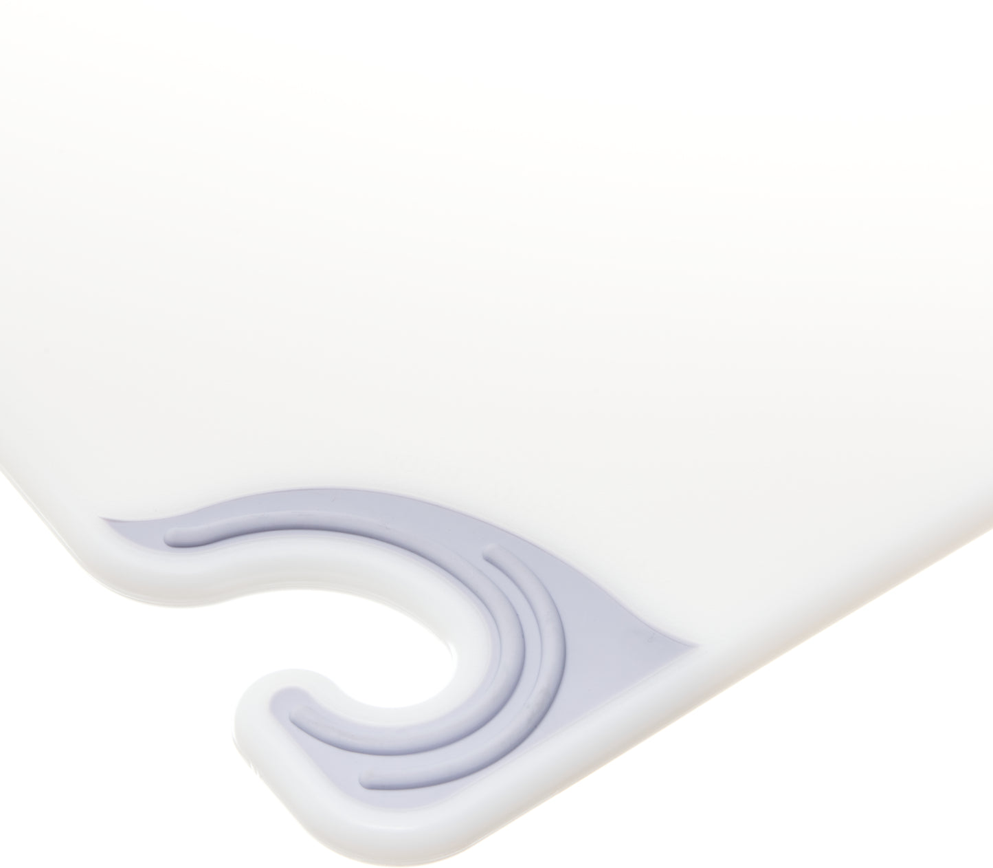 The white San Jamar Saf-T-Grip 18" x 24" x 1/2" Cutting Board is the ideal kitchen prep tool. It has a patented food safety hook that allows sanitary transport and storage while the integrated anti-slip grip corners keep the board in place.