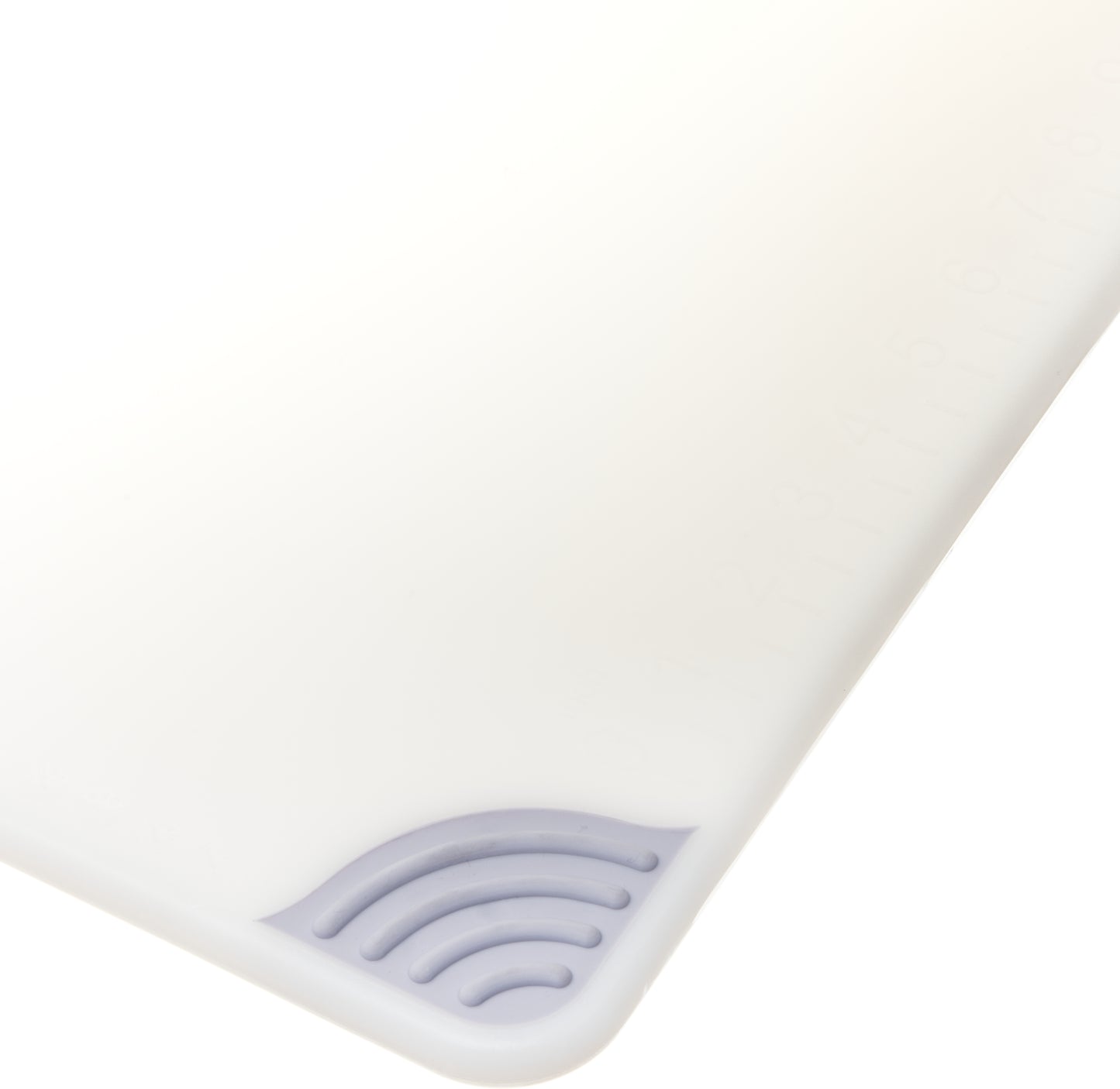 Features an integrated ruler for efficient portioning. This cutting board has a strong co-polymer construction that will not warp and is dishwasher safe for added convenience.