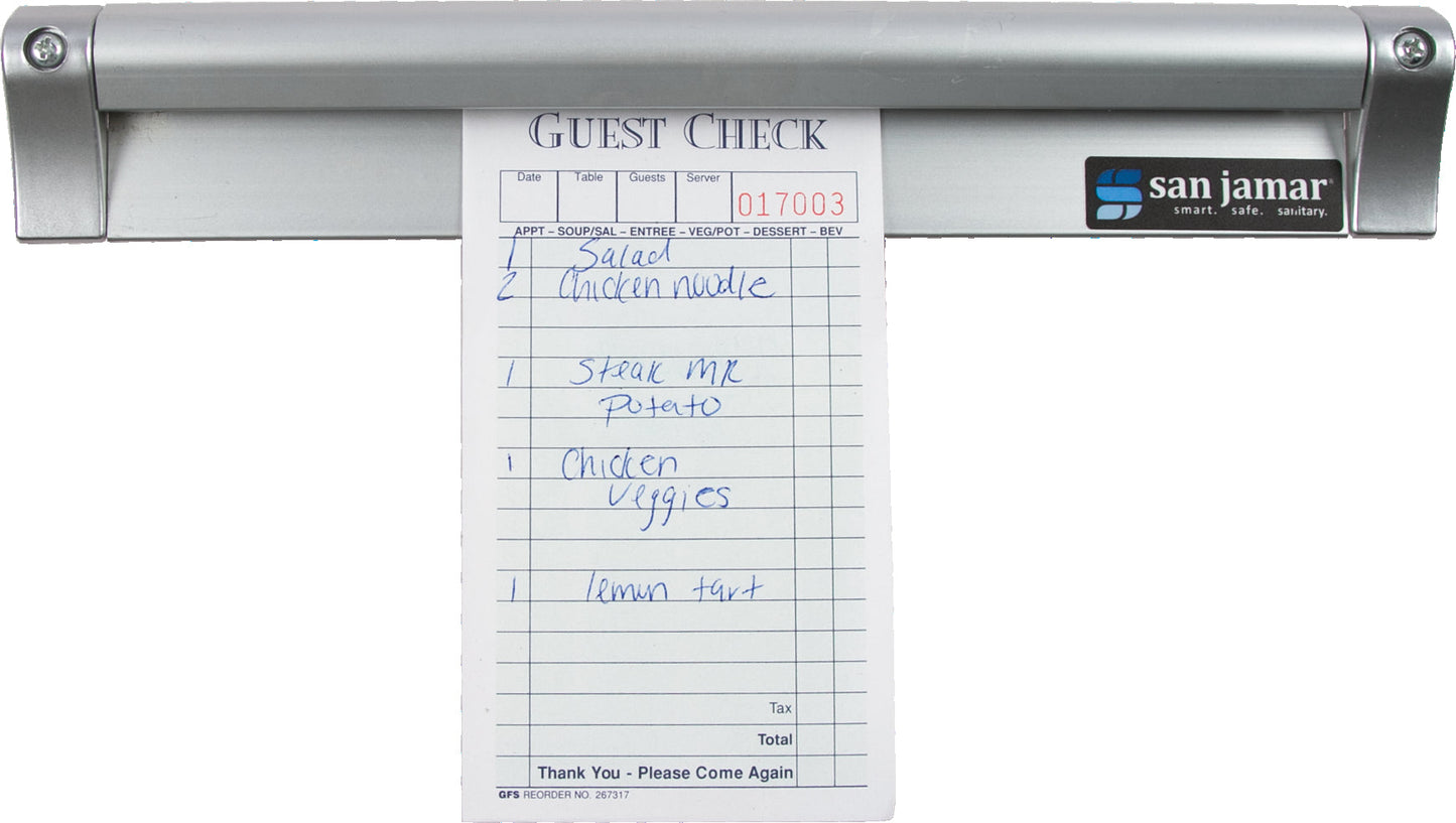 Keep your orders organized with an attractive check rack. The 12" San Jamar Aluminum Slide Check Rack has a sleek design to enhance front-of-house and open kitchens. It's made of anodized aluminum and features a screw-on end cap to guarantee excellent durability and longevity.