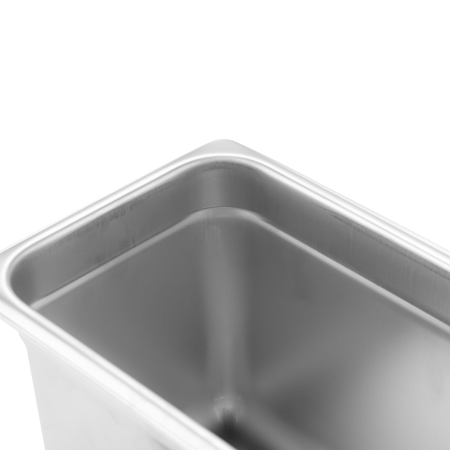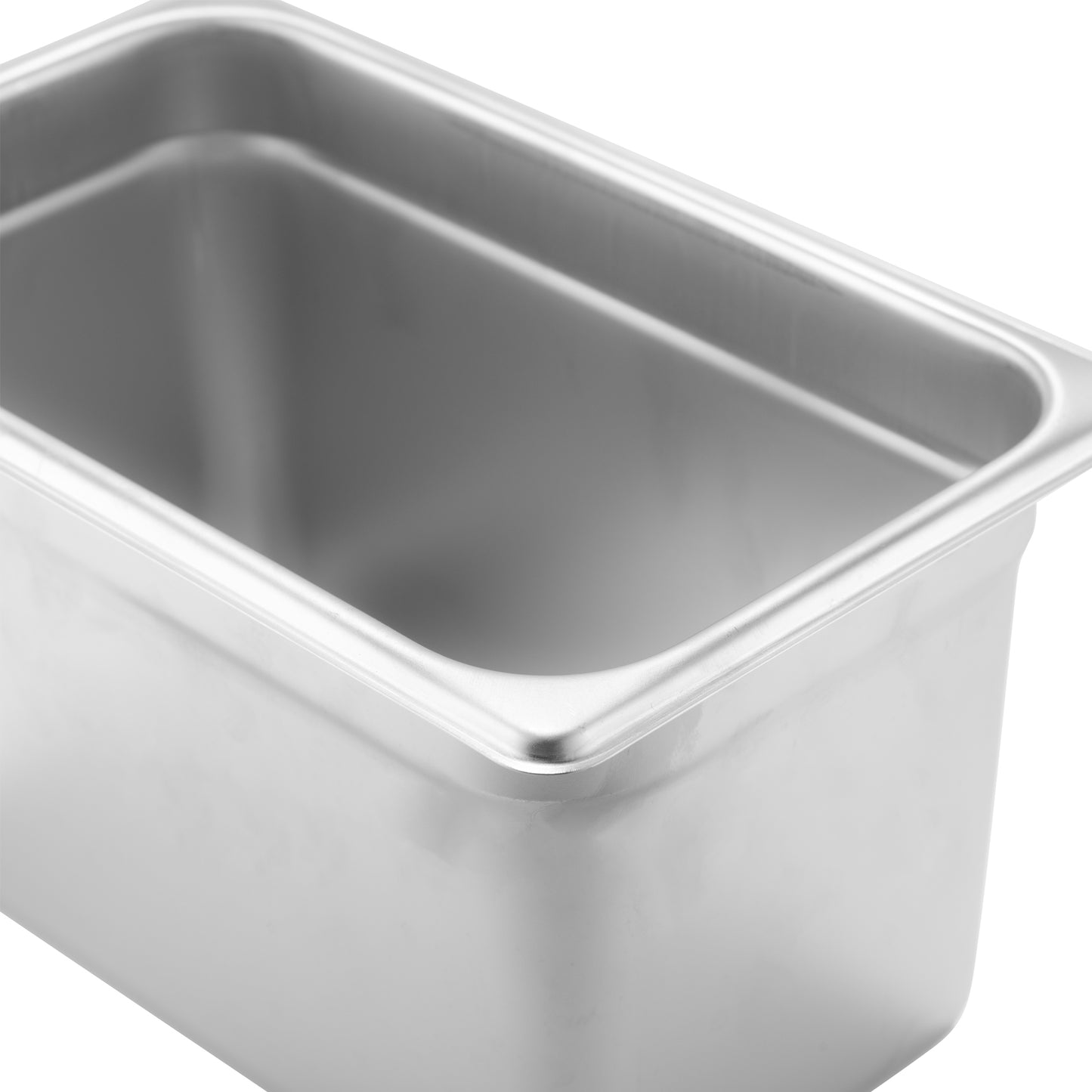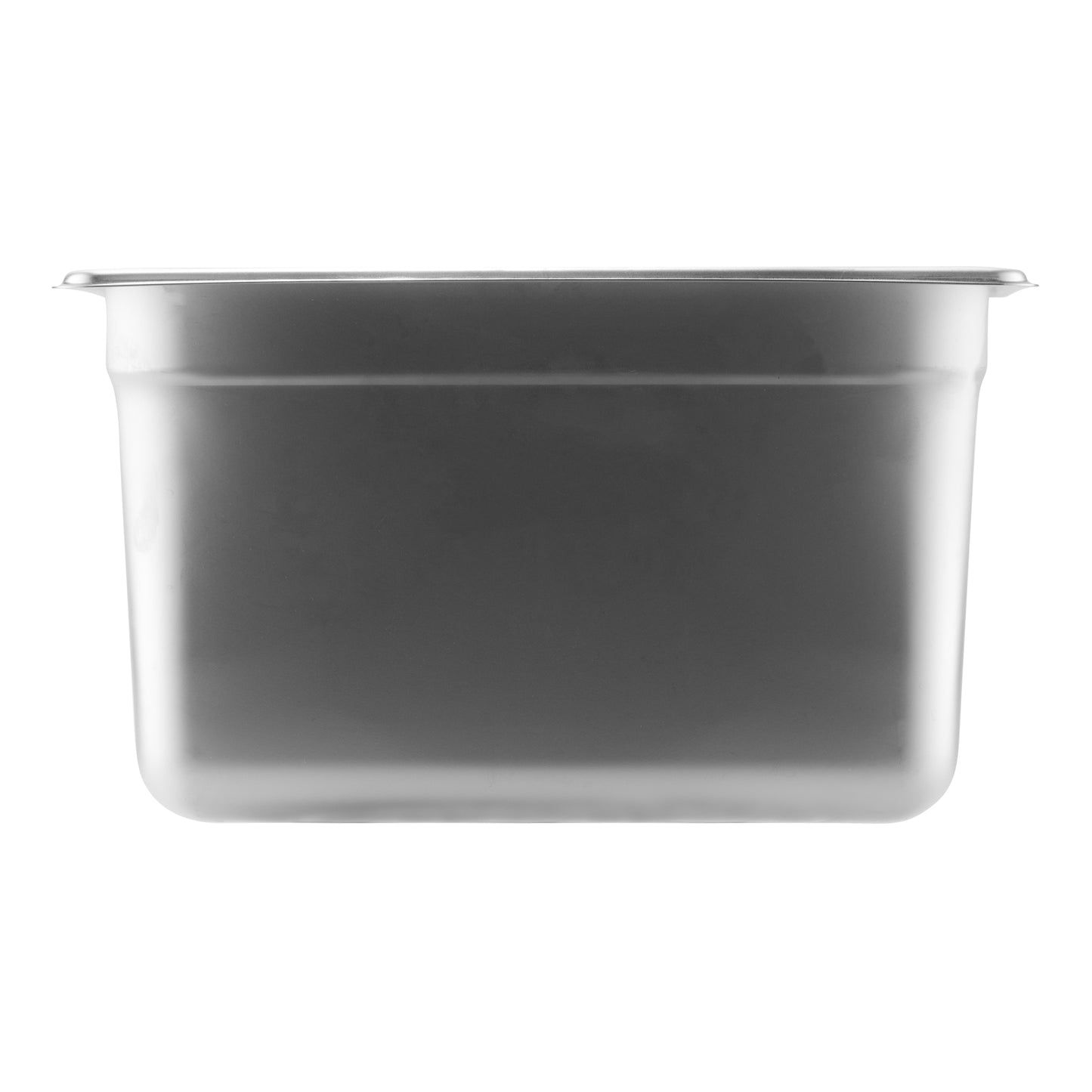 Designed with reinforced corners, this commercial food pan maintains its shape and resists denting. The rounded bottom corners allow serving spoons to get right into the corner to reduce food waste and offer simple cleaning.