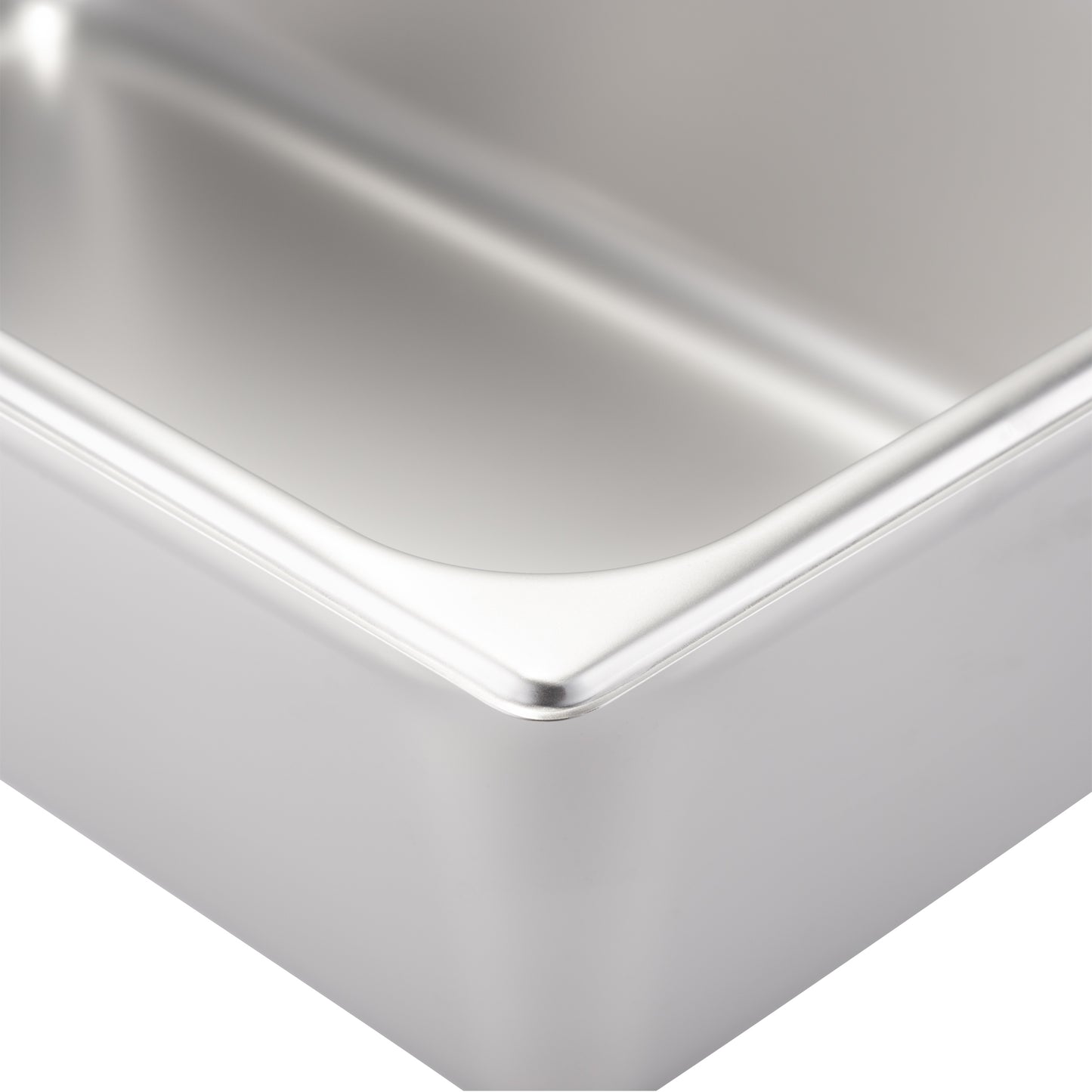 This commercial food pan has reinforced corners for additional strength and to help maintain the steam pan shape, even upon impacts. The pan has a rounded bottom to reduce food waste by allowing the serving spoon to get right into the corners. Also, the rounded corners make cleaning easier.