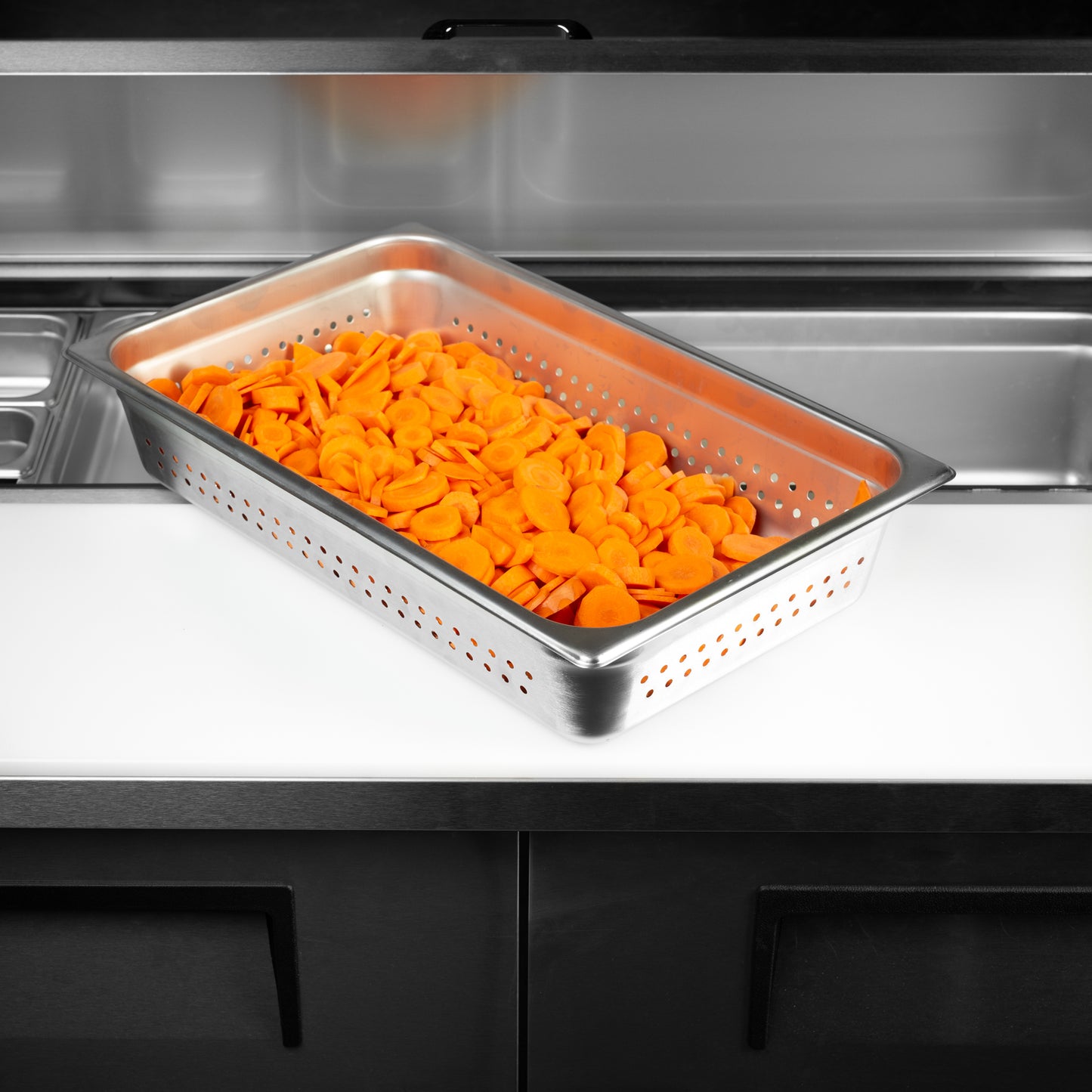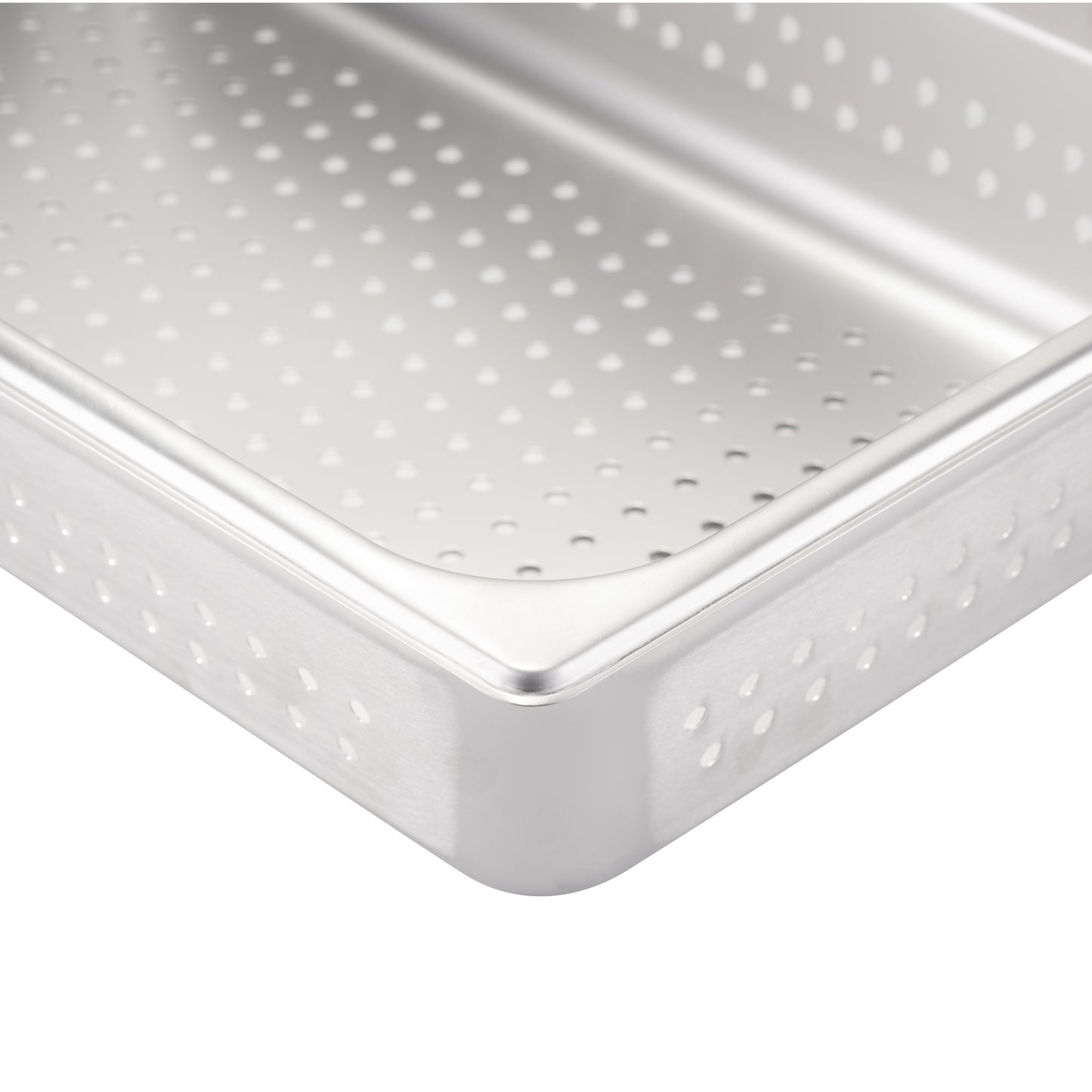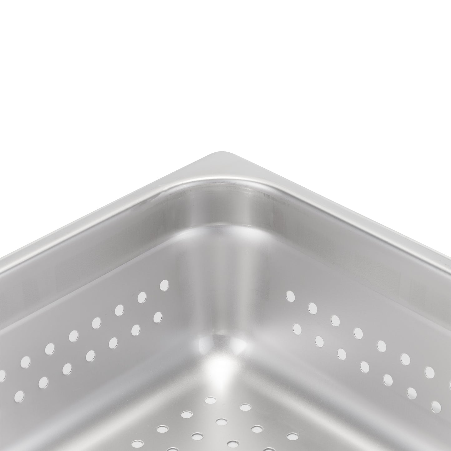 This commercial perforated food pan has reinforced corners for additional strength and to help maintain the steam pan's shape, even upon impacts. The pan has a rounded bottom to reduce food waste by allowing the serving spoon to get right into the corners. Also, the rounded corners make cleaning easier.