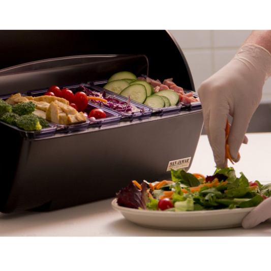 San Jamar Dome Garnish Center, 1 x 2 qt Tray, 4 x 1 pt Tray, 2 Snap-On Caddies - BD4005S